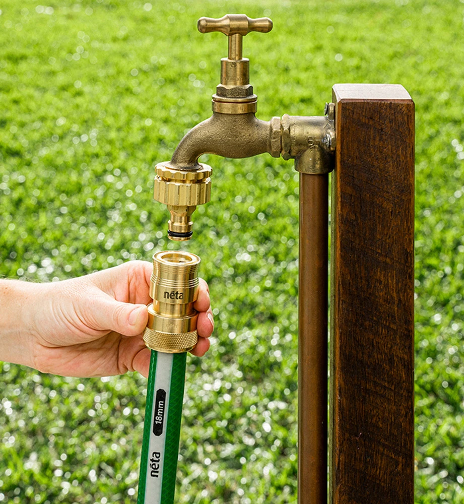 Designed for use with a 18mm garden hose allowing the connection to 12mm hose-end accessories such as sprayers, guns, nozzles, tap adaptors and couplers. Features the Neta Long Claw Grip Ring for leak-free watering.
