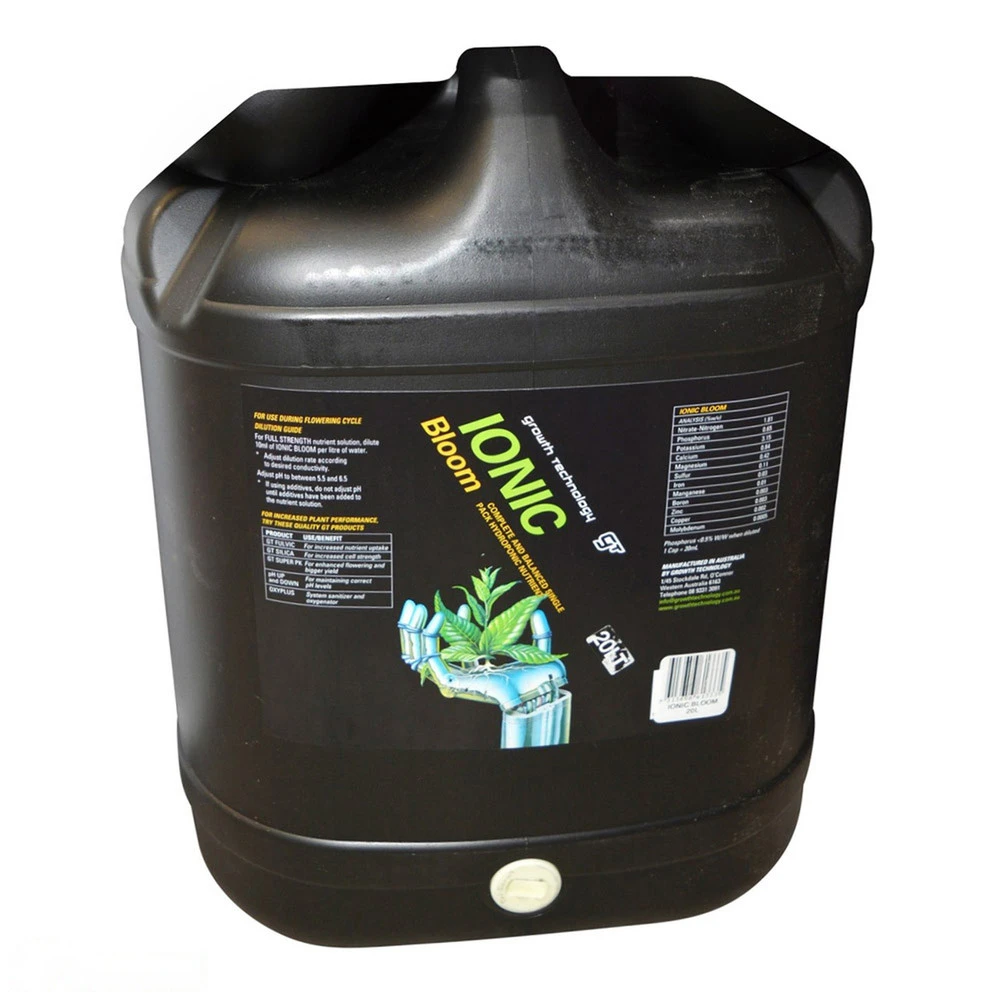 How to Use: Dilute Ionic Bloom with water before use. For hydroponics, adjust the dilution to reach the desired EC, typically between 5 and 10 mls per litre. In traditional gardening, a dilution of 5mls per litre of water is suitable, applied every one to two weeks depending on plant growth.